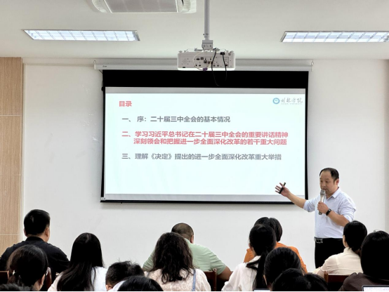 马克思主义学院院长以“深刻领会和把握进一步全面深化改革若干重大问题”为题做了专题辅导。他向参会者介绍了党的二十届三中全会的基本情况,重点介绍了全会的主题、进一步全面深化改革的重大性和必要性、重大原则,推进全面深化改革需要把握的一些重大问题。并分享了自己工作实际学习党的二十届三中全会的心得体会。