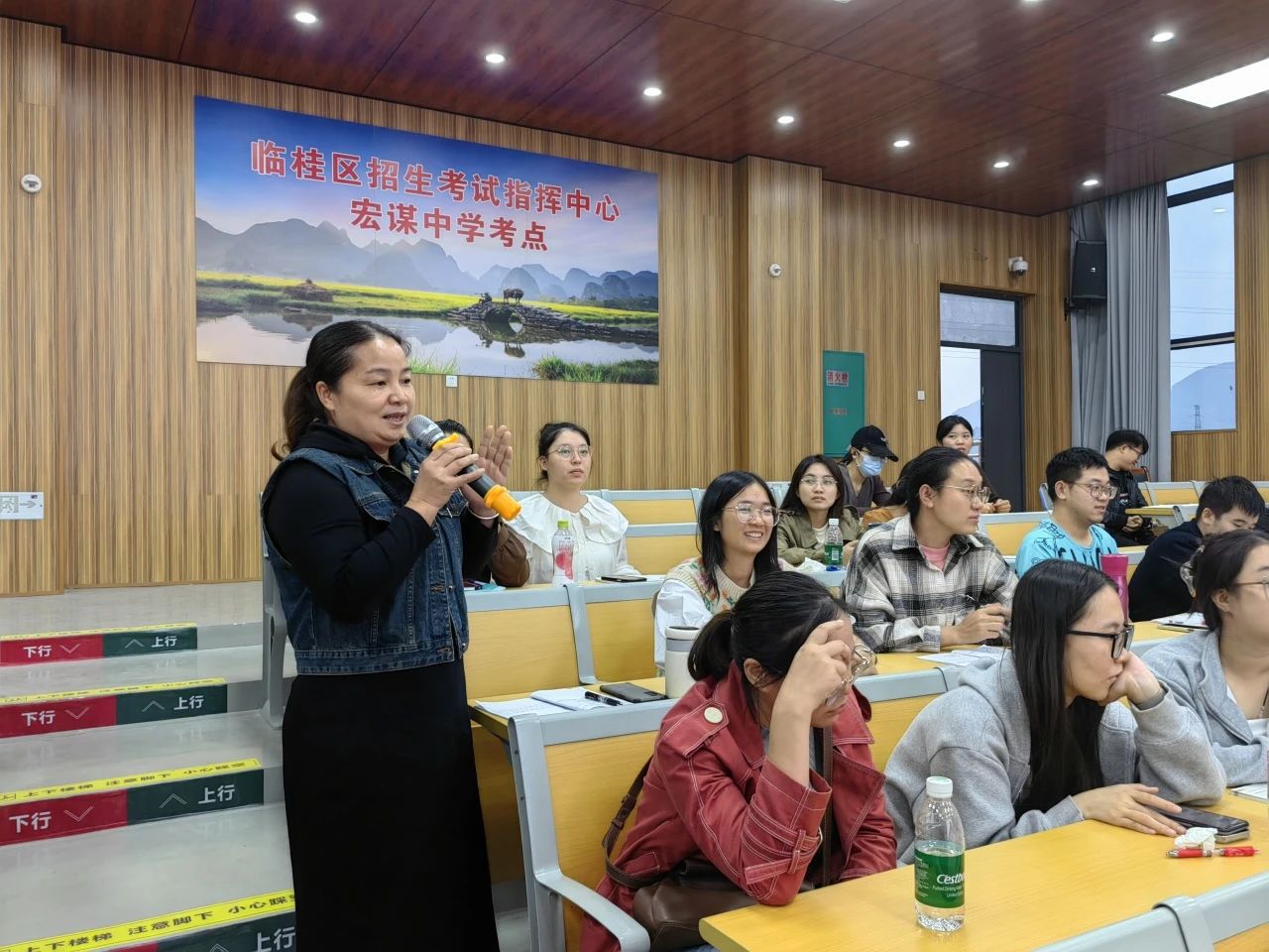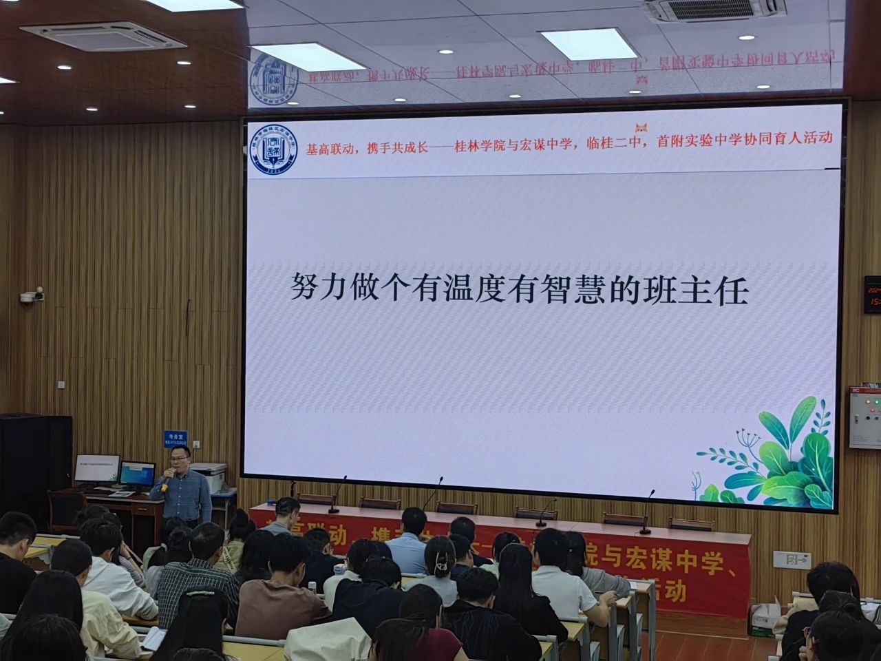为提高师范生教育教学与综合育人水平,提升师范生人才培养质量,同时促进实践基地学校年轻班主任成长,10月15日下午,人文学院联合临桂区宏谋中学、临桂二中、首附实验中学3所学校开展班主任工作论坛,特邀桂林市十九中优秀班主任林玉玫老师做专题报告。活动在宏谋中学报告厅举行,人文学院副院长,临桂二中书记熊凤长、校长黎云峰,宏谋中学副校长秦分胜出席活动,3所学校青年班主任以及学校在3所学校的英语、汉语言文学、数学与应用数学、体育教育4个专业的全体实习生参加活动,活动由人文学院英语教师教育教研室教师陆巧华主持。