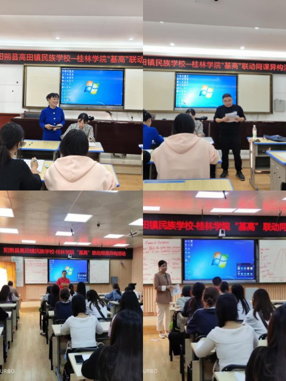 “同课异构”按照语文和英语两个不同学科分别在高田民族学校小学部阶梯教室和录播室同时进行。高田民族学校语文组、英语组和人文学院在该校的实习生参与了活动,人文学院部分大三师范生代表同步开展教育见习。