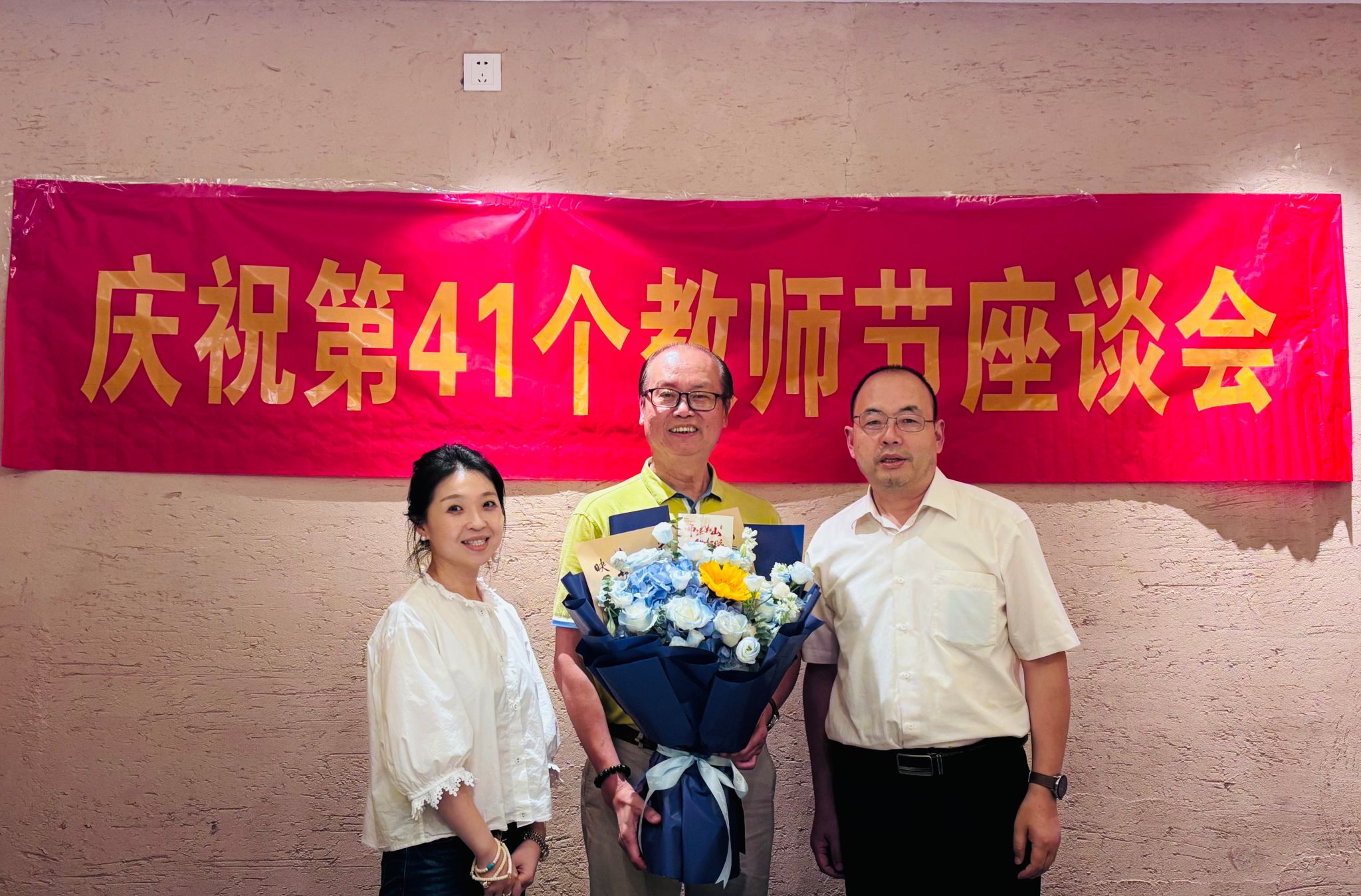 在座谈会上,领导班子给彭超教授献上鲜花,并向他表达节日的祝福。同时,也向为学院发展带来经验和智慧的银龄教师表达节日的问候。学院领导向与会人员介绍了学院开学以来的基本情况,介绍了目前正在开展的工作和下一步的工作计划。中国台籍教师张桂秋老师表示,在这里工作很开心、很幸福,只要身体允许,愿意为学校和学生多服务几年。其他老师表示,目前学校正在迎接本科教学合格评估,大家愿意为了学校更好的发展尽一份心、献一份力,全力以赴,推动迎评工作顺利展开,直至达成最终目标。