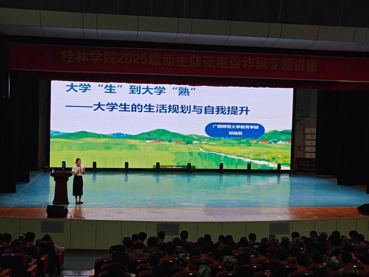 为引导2025级新生科学规划大学生涯,快速实现从“高中生”到“大学生”的角色转变,9月14日,信息工程学院特邀广西师范大学教育学部邓晓莉博士在弘善讲堂开展以 “大学‘生’到大学‘熟’——大学生的生活规划与自我提升” 为主题的专题讲座,2025级全体新生及辅导员参加活动。