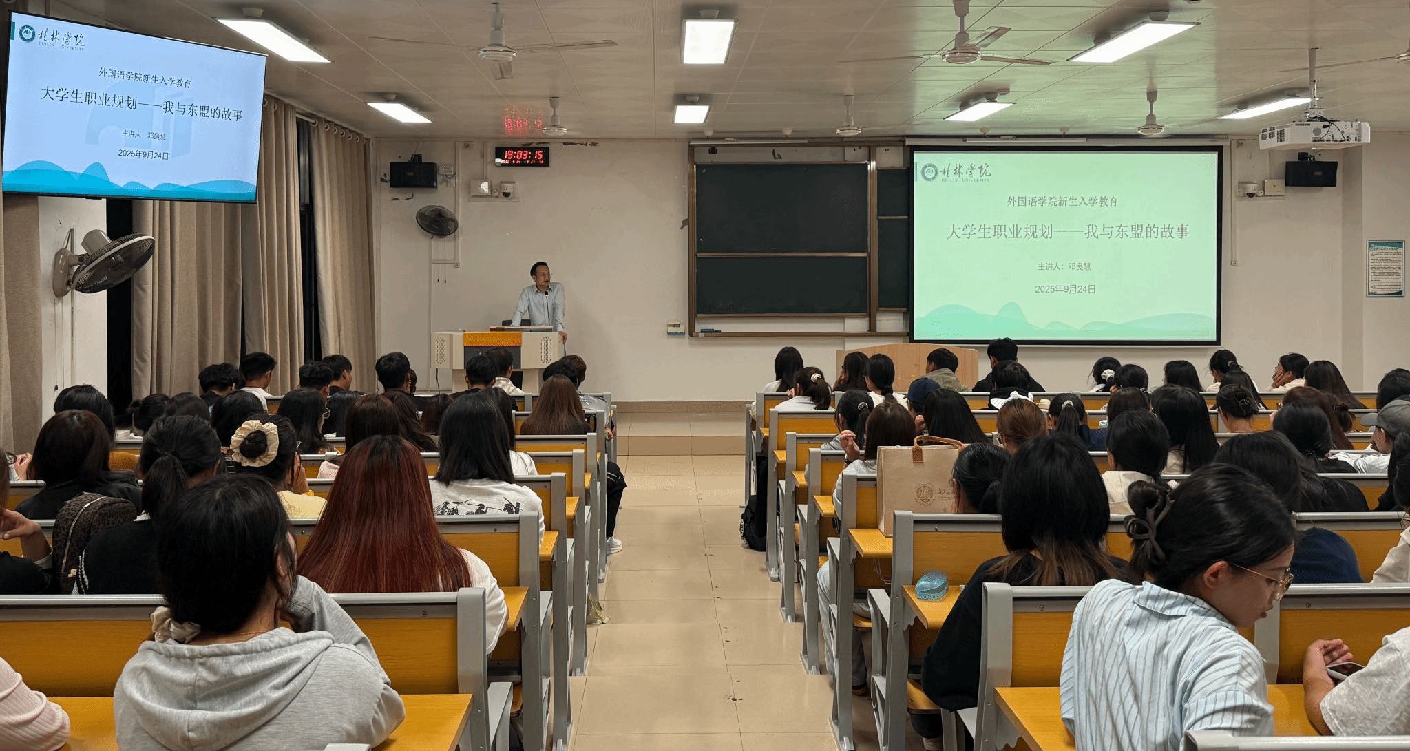 整场讲座案例鲜活、干货满满,既有跨国实践的经验分享,也有职业规划的实用建议,有效帮助新生缓解了专业认知困惑,明确了“外语 +”的复合型发展方向,为学院 2025 级新生入学教育与后续人才培养工作奠定了良好基础。
