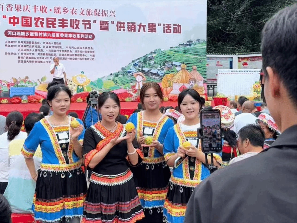 在猴背村百香果种植基地,学子们化身“新农人主播”,在丰收节主会场临时直播间内精准推介当地特色农产品。他们既突出高山黄金百香果“果香浓郁、酸甜适中”的特性,又融入瑶族打油茶、长鼓舞等非遗文化元素,打造具有民族辨识度的助农IP。2小时直播吸引超千人次观看,直接带动当地合作社当日百香果销售,学子们也在实战中掌握了文化传播、消费者心理洞察等技能。