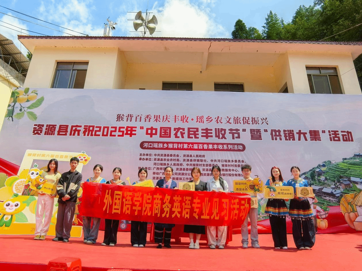 9月23日,外国语学院组织商务英语专业学子走进资源县河口瑶族乡猴背村,参与“中国农民丰收节”暨“供销大集”主题活动。此次活动以“跨境电商赋能乡村振兴”为核心,采用“三农主播实战演练+智慧农业观摩研学”双轨模式,推动学生将专业技能转化为助农行动,在实践中深化专业认知、厚植家国情怀。活动由中共资源县委员会、资源县人民政府主办,资源县农业农村局等承办,广西师范大学等协办。