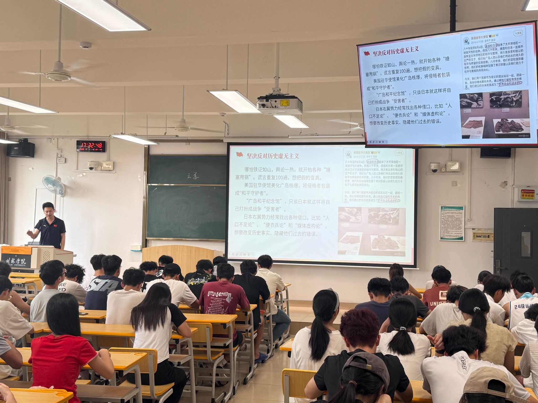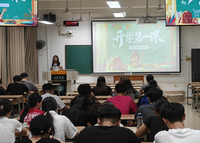 文化与传媒学院通过多元化模式召开“开学第一课”主题班会,同步融入安全教育环节,助力学生快速适应新学期;院长以“传承伟大抗战精神,争做强国青年”为主题,结合历史与文学的关联进行授课,让历史教育、文学赏析与价值引领深度融合;学院党总支书记在桂林市金雁学校2025年师生见面会暨第41个教师节庆祝大会上,以“赓续抗战精神,砥砺复兴力量”为题讲授“思政第一课”,通过回顾抗战历史、讲述桂林保卫战事迹,帮助学生强化思想自觉,筑牢家国情怀。