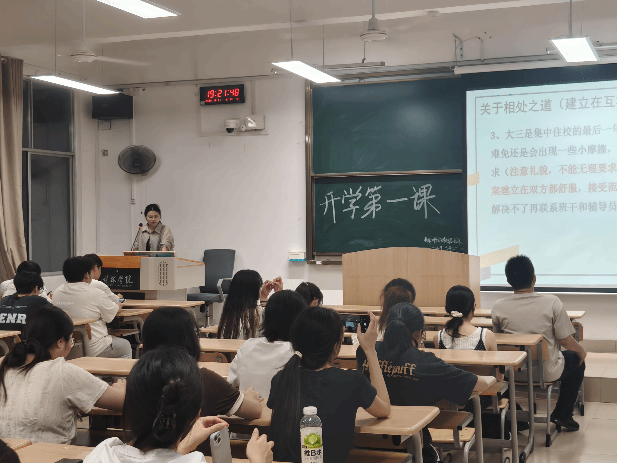 工商管理学院党总支书记面向主要学生干部和新生代表讲授课程,紧密结合当前形势与学生思想实际,深刻阐释新时代青年树立正确人生观、价值观的重要性,引导学生将个人成长融入国家发展大局。同时,学院邀请辖区派出所民警为新生开展“防范电信网络诈骗”专题讲座,用真实案例揭秘常见骗局,辅导员通过班会开展安全教育。此外,学院开展的考研经验交流会和校纪校规学习在全院掀起“比、学、赶、帮、超”的学习热潮。