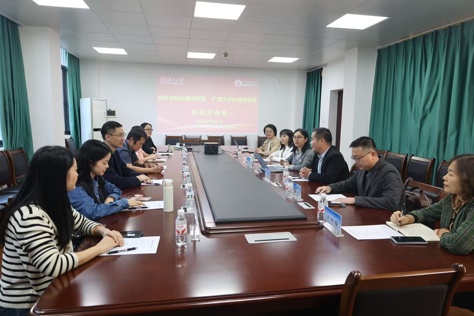 座谈会上,广西大学外国语学院党委书记首先对桂林学院一行的到访表示热烈欢迎,对两校外国语学院深化交流合作寄予殷切期望。随后,该院院长助理详细介绍了学院的发展历程、学科布局、师资队伍建设及教学成果,重点分享了小语种专业在课程体系构建、实践教学开展等方面的成熟经验。外国语学院副院长代表团队,简要介绍了学院的发展概况、专业设置及小语种人才培养特色,对广西大学外国语学院的热情接待与毫无保留的经验分享表达了衷心感谢。