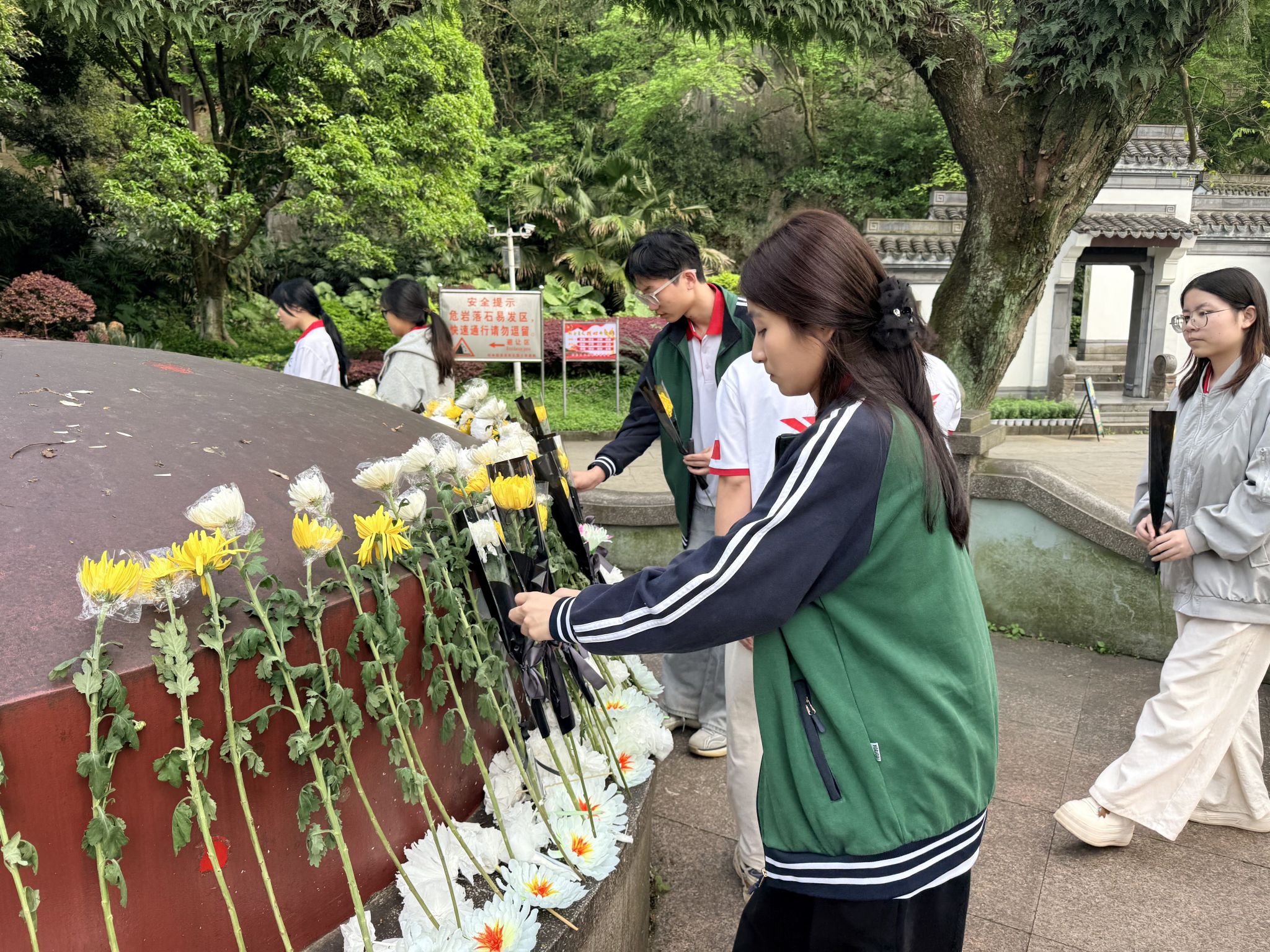 随后,全体人员面向团旗,举起右拳,重温入团誓词,铿锵有力的誓言回荡在纪念塔前,既是对入团初心的回望,也是对革命英烈的庄严承诺,更彰显了青年一代传承红色血脉、勇担时代使命的坚定决心。活动最后,师生们缓步上前,向英烈敬献鲜花,动作轻柔而专注,一束束菊花承载着青年一代对英烈的追思与敬仰。