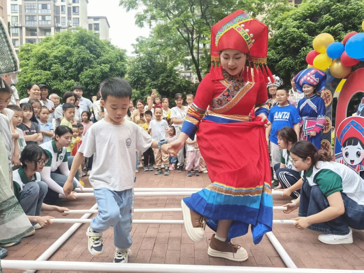 开幕式上,六位同学身着民族服饰带来精彩民族舞蹈,灵动舞姿尽显壮乡风情,拉开活动序幕。现场还设置背篓接球、竹竿舞、萌趣赶鸡、五色糯米饭品鉴等民俗互动环节,融趣味性、体验性、文化性于一体。现场欢声笑语不断,业主们纷纷点赞,对此次文化活动表示十分满意。