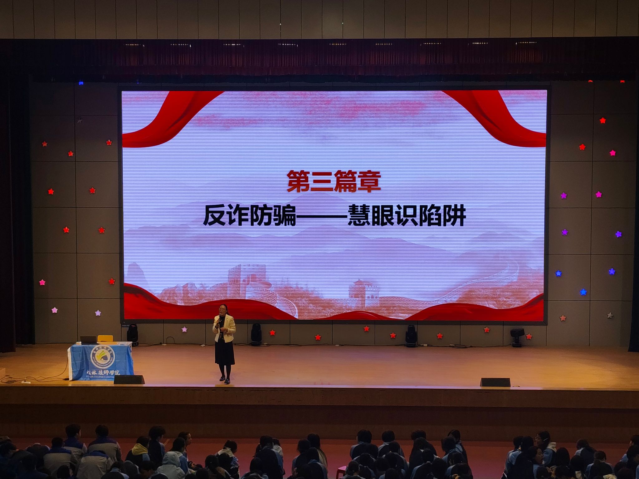 4月15日是第十一个全民国家安全日。为深入贯彻落实总体国家安全观,持续巩固全民国家安全教育日宣传成效,全面增强青年学生国家安全意识、网络安全防护能力与反诈防骗意识,筑牢校园安全防线,4月22日,由共青团桂林市委员会、桂林市12355青少年服务台主办,桂林技师学院承办,学校金融与法律学院普法团队协办的“筑牢法治防线,践行总体国家安全观”主题活动在桂林市圆满举行。此次活动聚焦于增强青少年学生的国家安全意识、网络安全意识及反诈防骗能力,活动吸引了桂林技师学院1233名学生踊跃参与,现场座无虚席,学习氛围热烈浓厚。