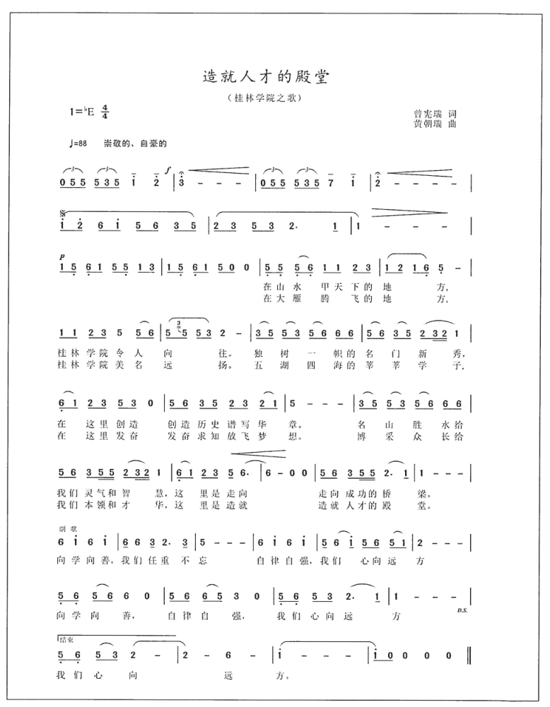 《造就人才的殿堂(桂林学院之歌)》是在原广西师范大学漓江学院校歌歌词《造就人才的殿堂(广西师范大学漓江学院之歌)》基础上,经原词作者、广西音乐文学会原会长、桂林市文联原副主席曾宪瑞先生生前同意,对部分歌词进行修改完善而成。