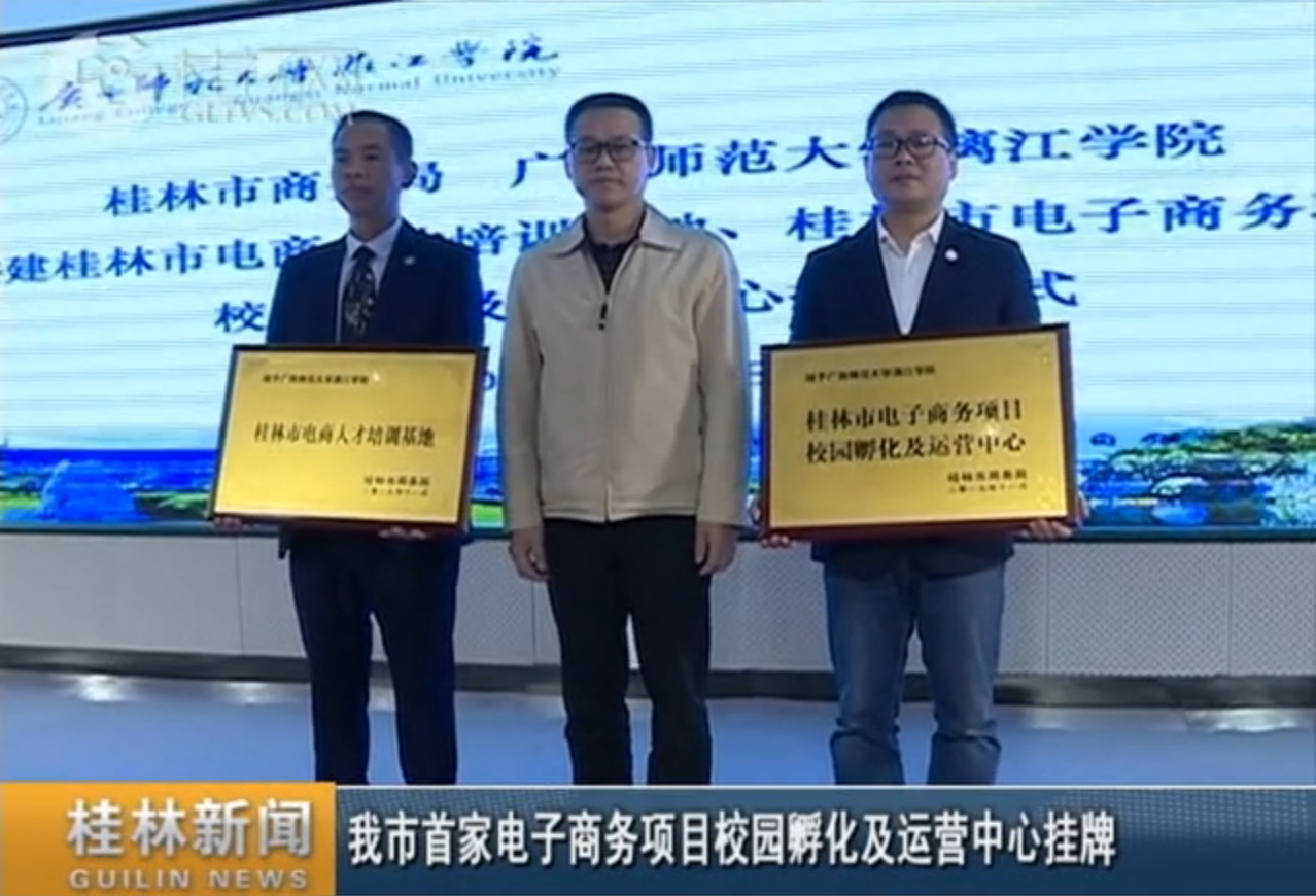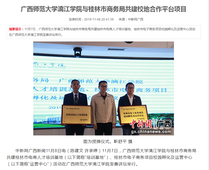 11月7日,我校与桂林市商务局共建桂林市电商人才培训基地(以下简称“培训基地”)、桂林市电子商务项目校园孵化及运营中心(以下简称“运营中心”)活动在至善讲坛举行。我校成为桂林市首家电子商务校园孵化及运营中心。得到中国新闻网、桂林晚报、桂林电视台等多家媒体关注。