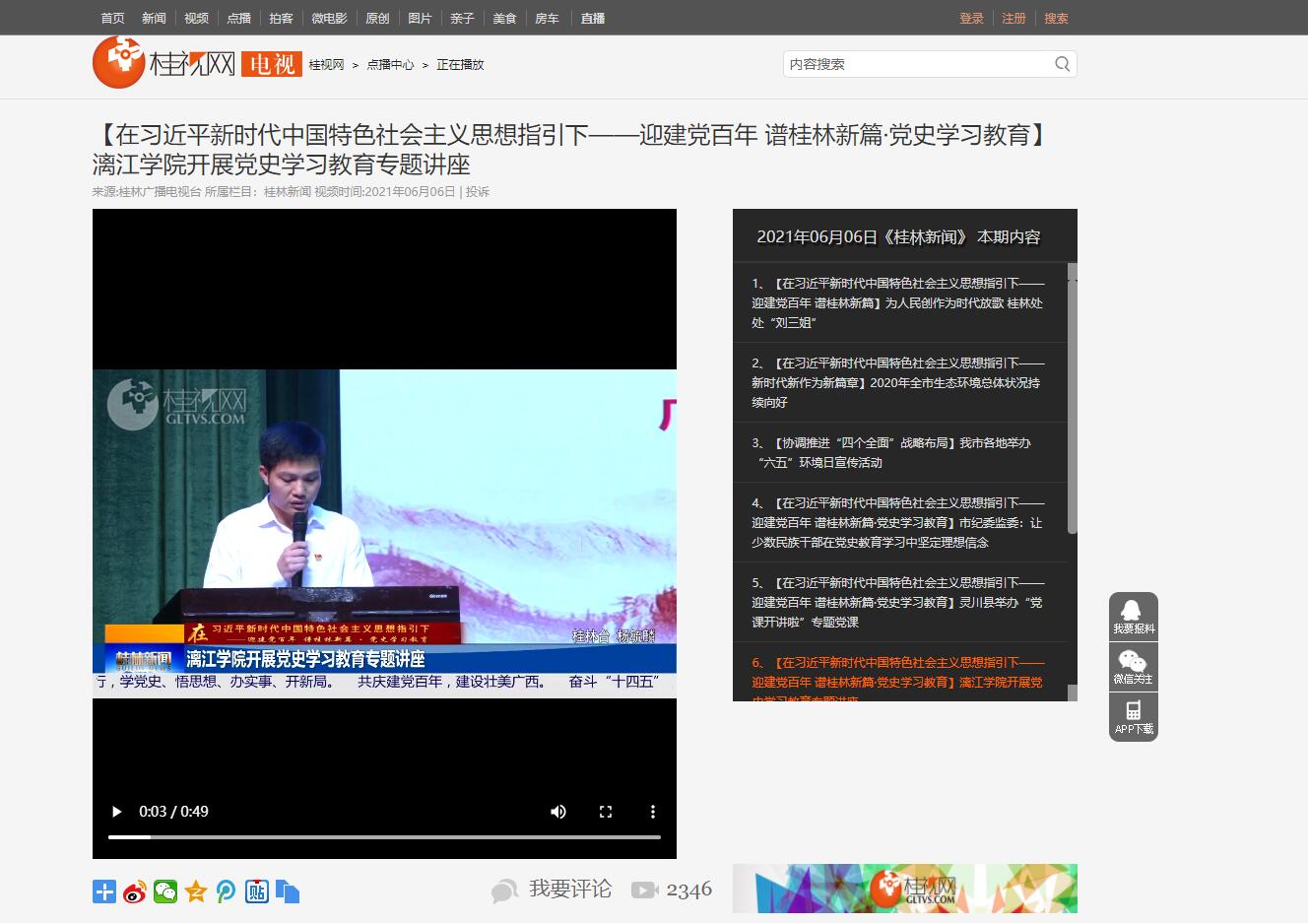 桂林电视台:《【在习近平新时代中国特色社会主义思想指引下——迎建党百年 谱桂林新篇·党史学习教育】漓江学院开展党史学习教育专题讲座》
