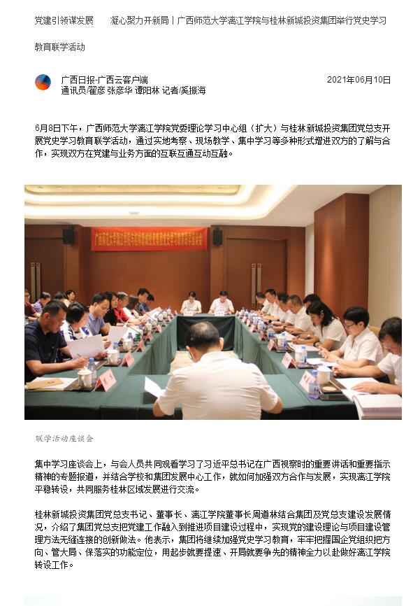 广西日报-广西云平台:《党建引领谋发展 凝心聚力开新局丨广西师范大学漓江学院与桂林新城投资集团举行党史学习》