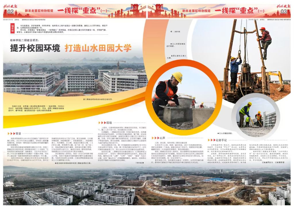 1月23日出版的桂林晚报推出“新春走基层特别报道 一线探‘重点’”。深入重大项目的建设一线,书写新气象、新变化,从建设者们的奋斗姿态中展望桂林更加美好的明天。报道以《桂林学院二期建设项目:提升校园环境 打造山水田园大学》为题介绍了我校二期建设项目进展。