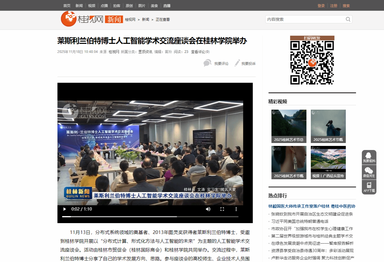 桂林广播电视台:《莱斯利兰伯特博士人工智能学术交流座谈会在桂林学院举办》