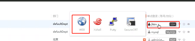 4.点击对应方式即可进行连接(通常直接使用WEB进行连接,Xshell、putty、CRT需要下载客户端调用工具才可使用)