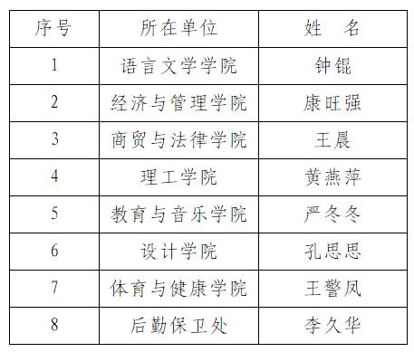 根据学校《关于做好2021年广西高等学校青年教师教学业务能力提升计划培训对象遴选工作的通知》(漓院政人事〔2020〕37号)、广西高等学校师资培训中心《关于举办2021年广西高等学校青年教师教学业务能力提升培训班的通知》(师培〔2020〕14号)精神,经教师个人报名、各单位推荐、人力资源部审核,确定我校钟锟等8名同志符合2021年广西高校青年教师教学业务能力提升计划培训对象条件。现将拟推荐参加人员名单公示如下: