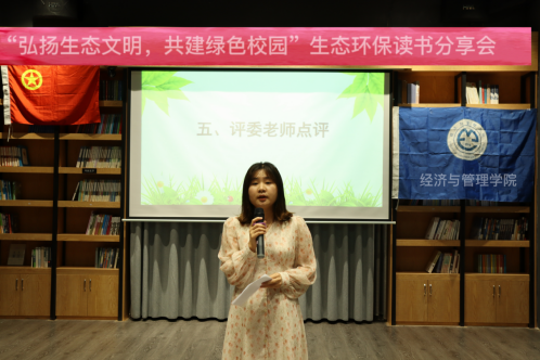 活动伊始,主持人就生态文明理念的重要性及如何共建绿色校园展开了此次读书分享会。经过初赛的评选,最终六名选手入围决赛。其中2021级经济学黄晨妍同学分享了《寂静的春天》,书中介绍人应与自然合作、与自然和谐共处,让同学们对生态文明有了更深刻的了解,明白了真正意义上的保护生态环境。最后,赵玲老师对此次读书分享会进行总结,同时希望同学们能从此次分享会中知道读书和生态文明理念的重要性,共同携手构建绿色美好校园。