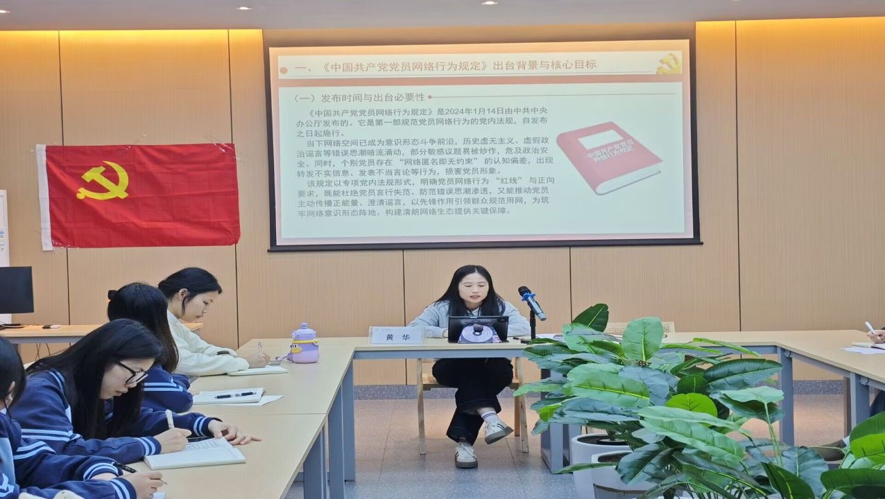 党支部书记从《中国共产党党员网络行为规定》出台背景、核心目标、主要内容及实践要求四个维度展开系统讲解。党课循序渐进、深入浅出,详实阐述了关于“政治红线”“纪律红线”“作风红线”的深刻内涵与规范要求,强调了学生党员作为青年群体中的先锋力量,不仅要时刻绷紧网络纪律之弦,自觉维护党和国家形象,更要主动扛起网络正能量传播义务,讲好中国故事、弘扬主旋律,传递正能量,以实际行动筑牢网络意识形态安全防线,共同营造清朗、健康、向上的校园网络生态。