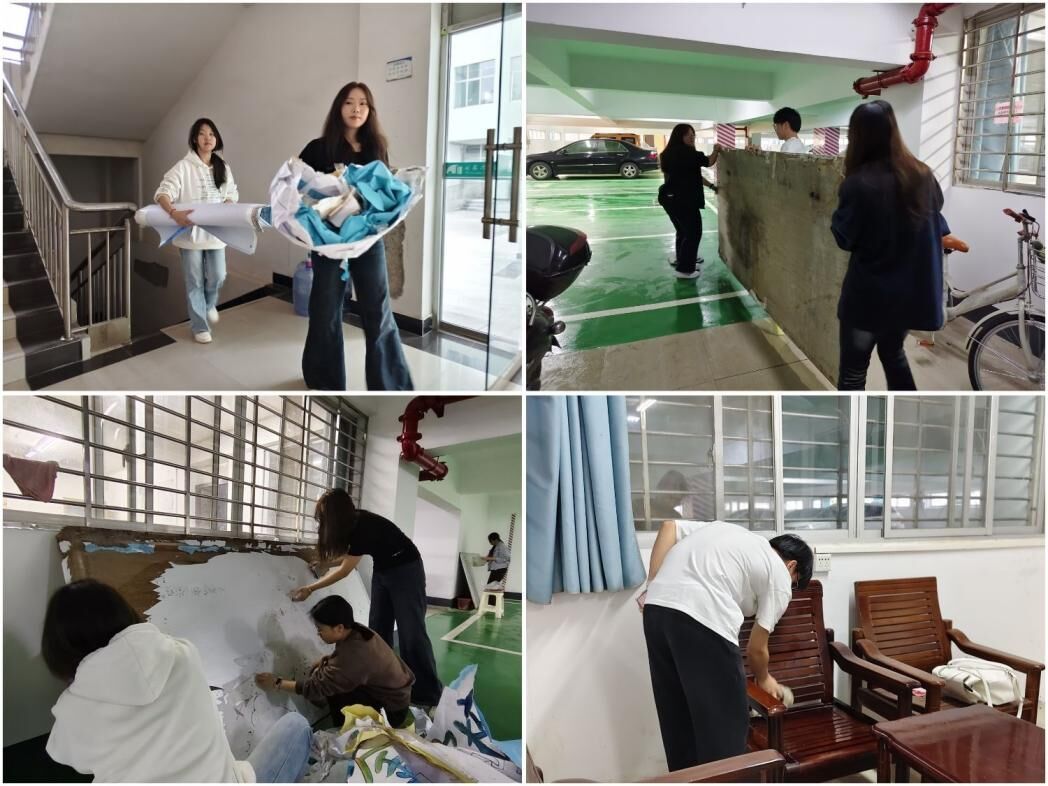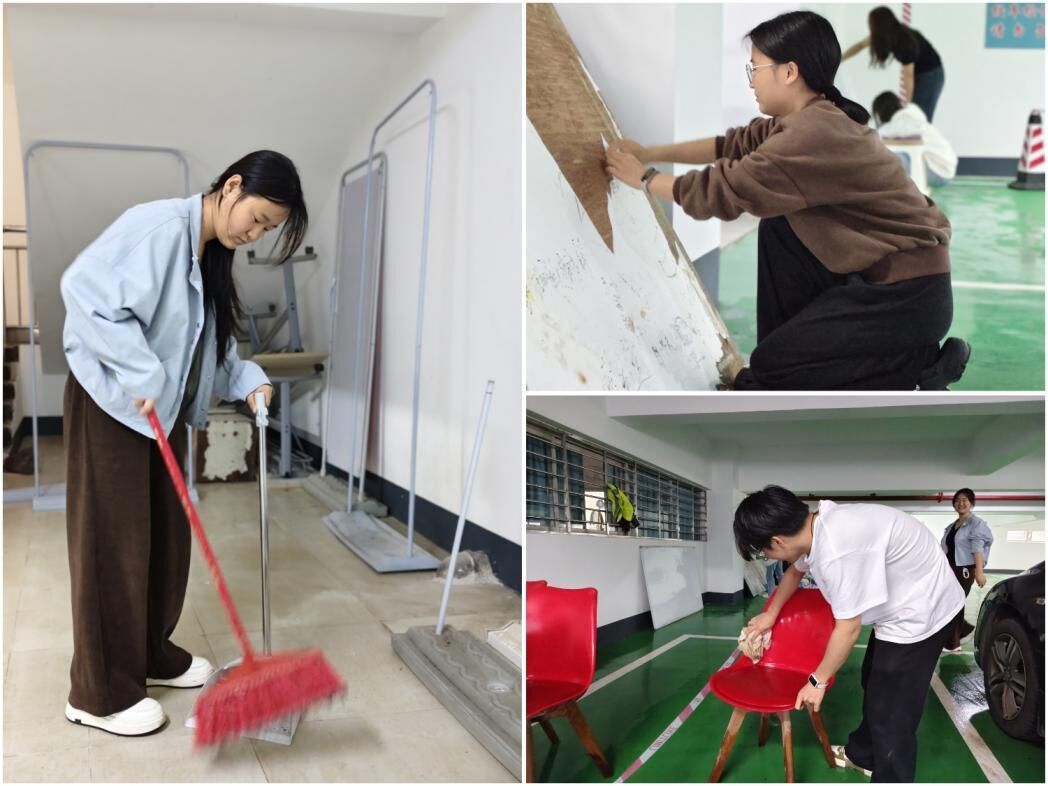 活动现场,志愿者们分工协作,手持扫帚、簸箕、抹布等清洁工具,对学院周边公共区域开展全方位清洁整治。清理废旧杂物、规整各类板材、清除墙面胶痕,每个角落都留下了志愿者们忙碌的身影;擦拭桌椅缝隙、清扫地面死角、拖拭污渍痕迹,大家以一丝不苟的态度,让环境变得整洁明亮。从分工到协作,从细节到全局,志愿者们相互配合、齐心协力,用汗水让学院环境焕然一新。