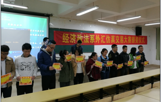 2016年12月8日,经济政法系外汇仿真交易大赛颁奖仪式暨客座专家专题讲座在001室隆重举行。2014级金融学全体同学、经济政法系教研室胡乐天、向爱保老师,以及桂林市金泽投资公司总经理龚占冰先生等参加了此次仪式。