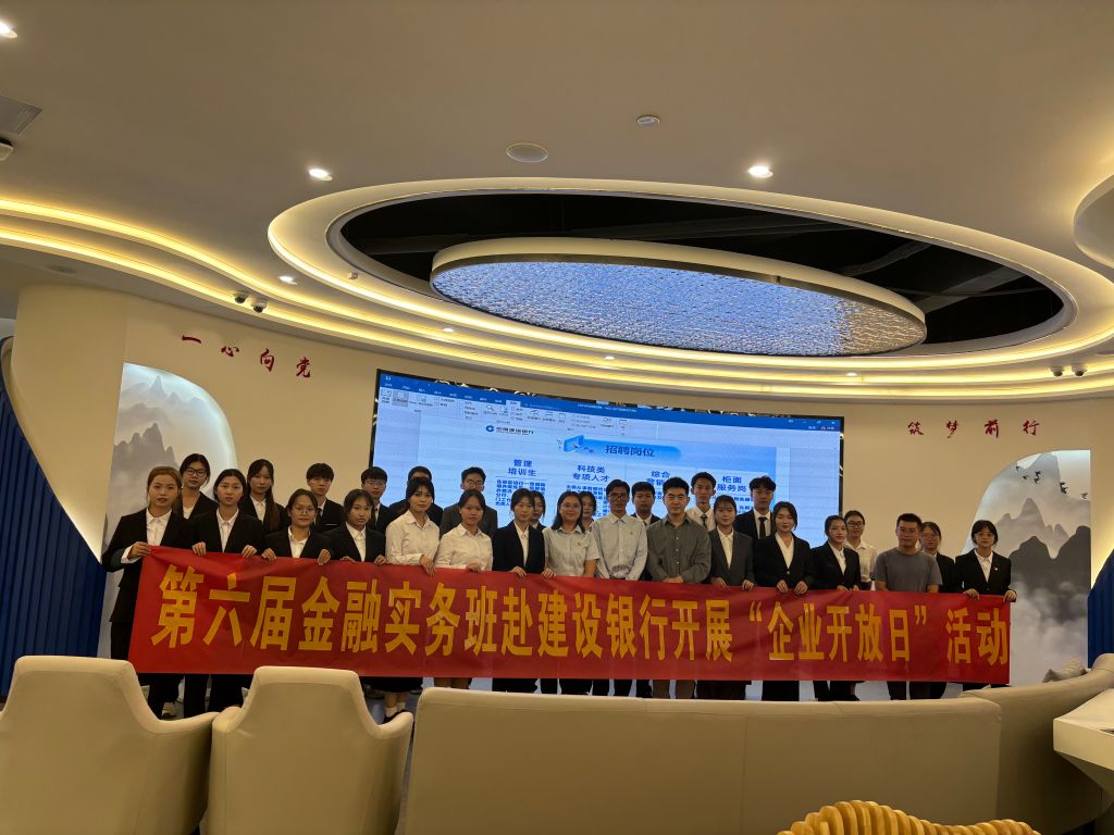 为提高金融实务班学生的行业认知能力,加强实践教学环节,10月16日下午,金融与法律学院第六届金融实务班在学院党总支书记、胡乐天老师及梁志民老师的带队下,前往中国建设银行桂林分行开展“企业开放日”活动。此次活动旨在通过实地调研学习,加深学生对银行业的理解,明确未来职业发展方向。