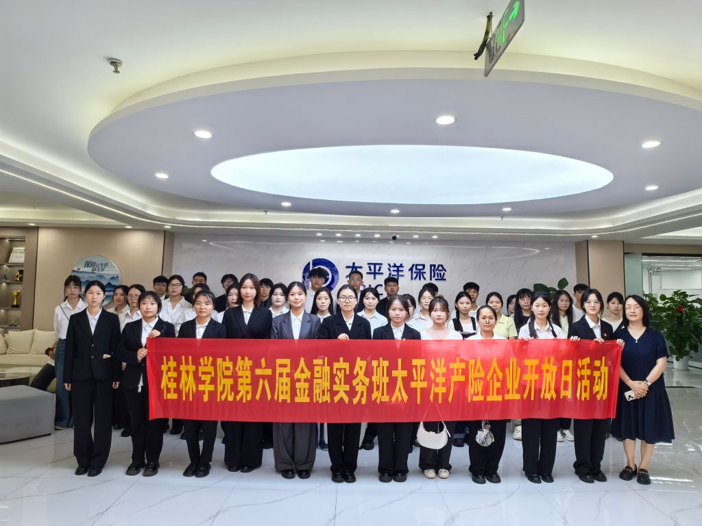 5 月21 日下午,金融与法律学院第六届金融实务班25名学子以及部分毕业生,在谭艳斌老师和韦翔老师的带领下,开展了企业开放日活动。此次活动的接洽企业为太平洋财产保险股份有限公司桂林中心支公司,是学校的五星级校外实践教学基地和就业育人基地。