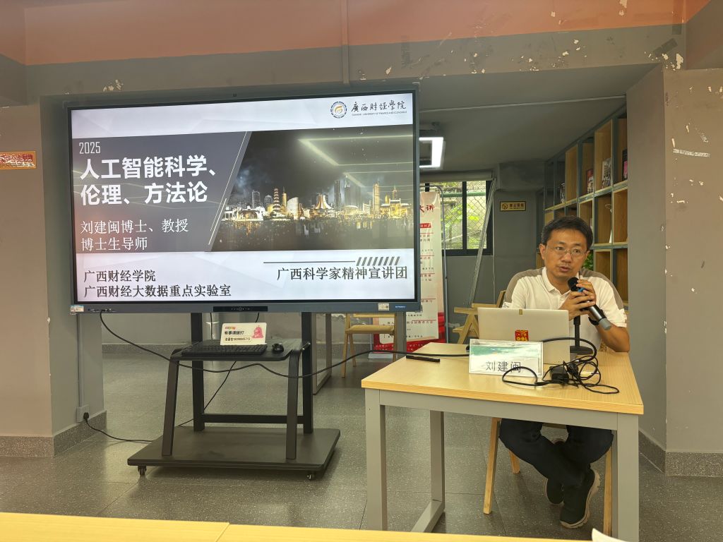 本次讲座特邀广西财经学院大数据与人工智能学院教授、国家教育部博士研究生学位论文评议专家、国家哲学社科基金成果评审专家刘建闽做主题报告,讲座主题紧扣时代脉搏——《人工智能科学、伦理、方法论》。