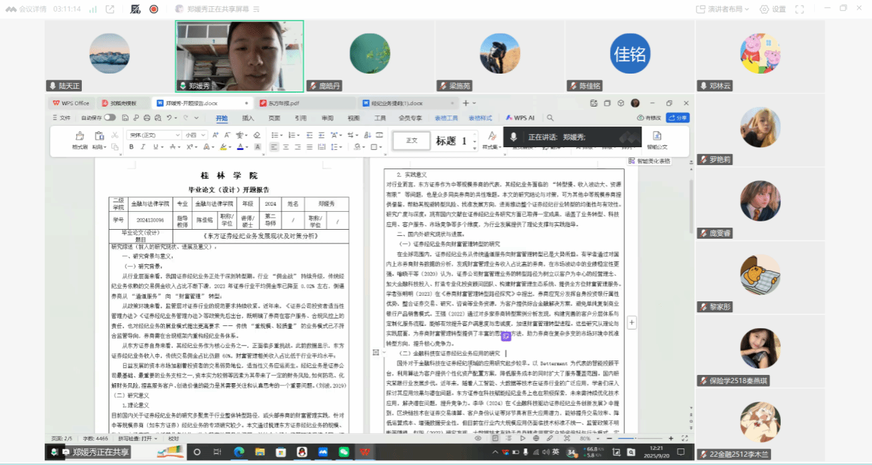 学院高度重视开题答辩工作,提前统筹规划,构建了“学院统筹—教研室落实—导师指导”三级协同工作机制。金融教研室根据学院制定的《开题答辩评审细则》,明确选题契合度、研究框架完整性、创新性等核心评价指标;答辩秘书团队提前完成材料审核与流程安排等准备工作;论文指导教师则通过小组研讨和一对一辅导等多种形式,帮助学生完善研究设计,确保每位毕业生均以规范、扎实的开题准备参加答辩。