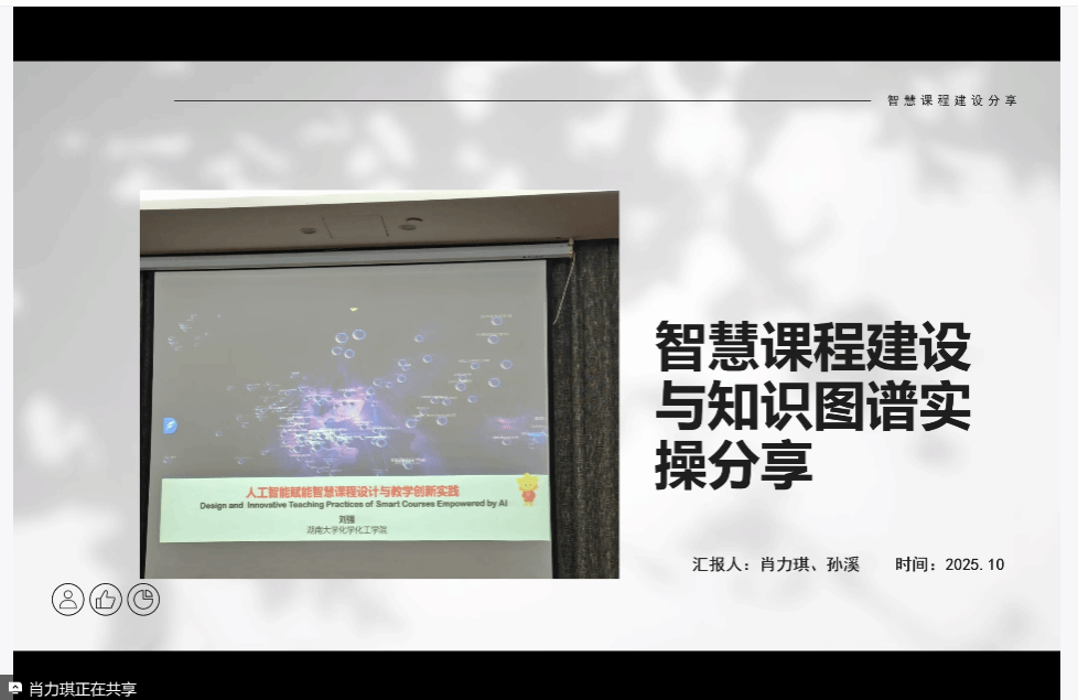 在分享会上,与会教师结合各自的研究专长与学习心得,对研修内容进行了系统梳理与分享。肖力琪老师解析了智慧课程的核心概念与特征,通过对比其与在线课程的差异,重点阐述了如何运用“疏、导、连”方法构建知识图谱,并完整演示了从教学大纲到知识图谱的生成全过程。孙溪老师则聚焦于AI的教学实践应用,分享了如何利用AI技术搭建课堂智能助教,并介绍了在过程性评价、智能作业批改及能力导向评估等方面的创新方案。庞皓丹老师针对AI时代的教育变革提出了自己的见解,她认为教育的核心应从知识传授转向培养学生运用、批判与评估AI的能力;教师的角色也应从信息传递者,转变为通过设计深度问题来激发学生独立思考与批判性思维的引导者。整个分享会内容充实、案例生动,主讲老师的分享不仅传递了最新的行业讯息与教学理念,更提供了具有实操性的方法与工具,为与会教师带来了深刻的启发。