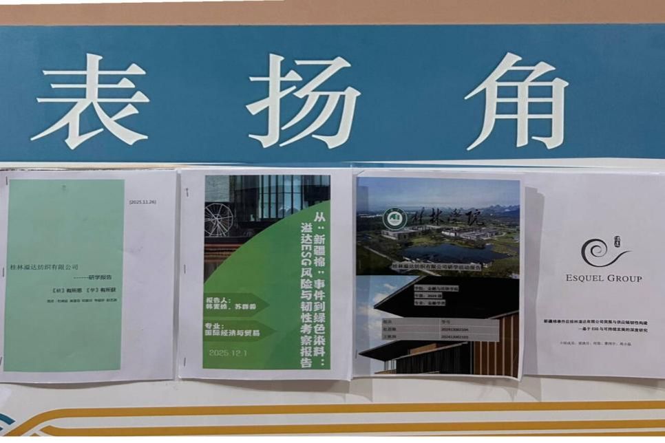 近日,金融与法律学院赴桂林溢达纺织有限公司“十如零碳园区”主题研学活动优秀成果展示顺利开展。80余名学子组建的多个研学小组,历经实地调研、深度研讨与精心打磨,形成了一批聚焦ESG与可持续发展的高质量专题报告,同步剪辑的研学精彩视频也同步亮相,生动呈现了理论与实践碰撞出的智慧火花,为此次“探索绿色供应链,聚焦可持续金融”研学之旅画上圆满句号。