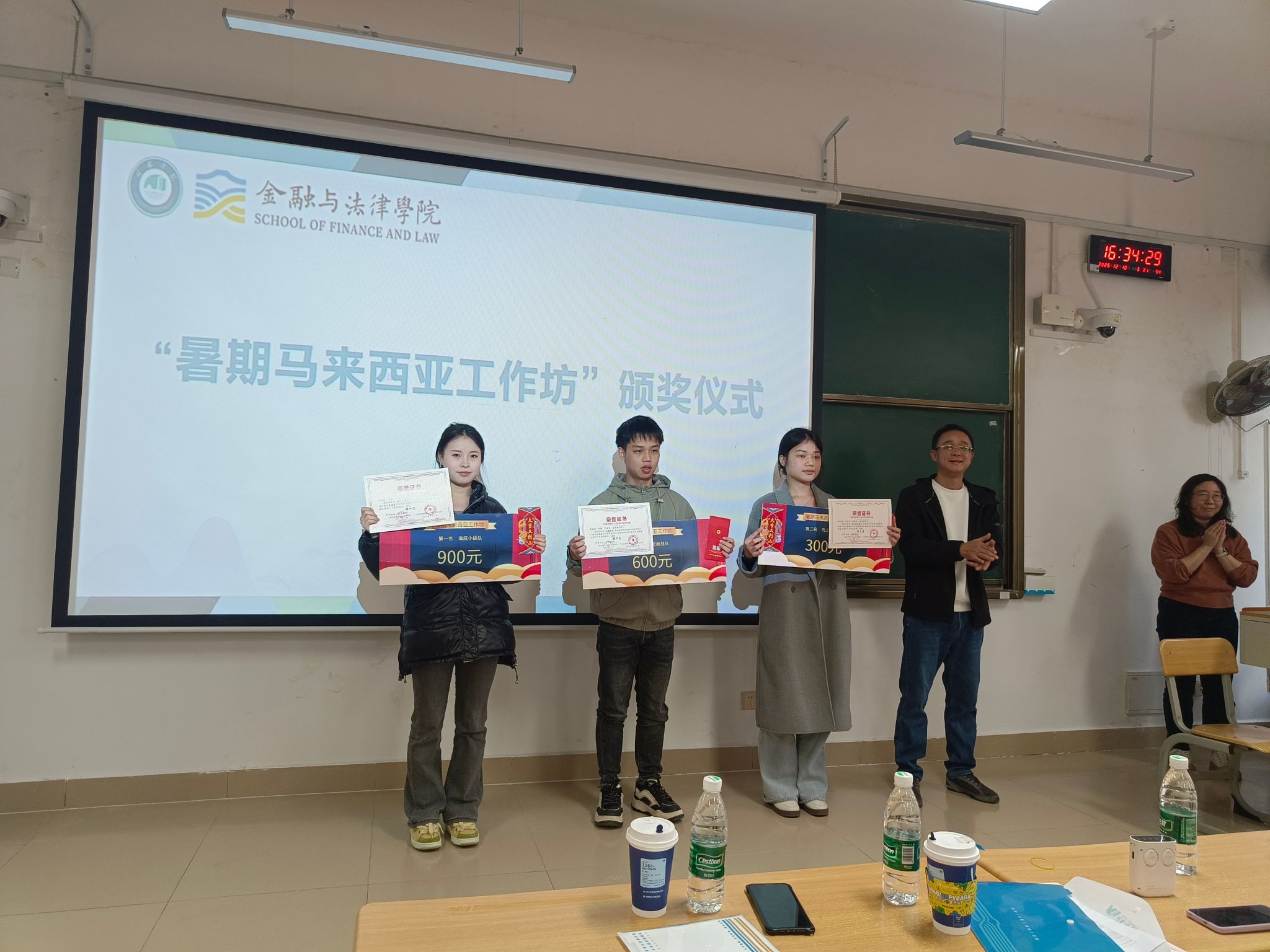 随后进行的“暑期马来西亚工作坊”颁奖仪式将活动推向高潮。活动表彰了在暑期工作坊中表现突出的学生团队,依次颁发了奖项并为获奖学生现场发放奖金,以鼓励学生在跨境电子商务领域的实践探索与创新能力。活动最后,专家与获奖团队学生合影留念,为本次兼具学术性与实践性的交流活动画上圆满句号。