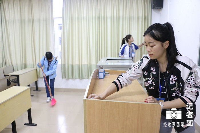 当日下午,团学成员带着各自准备好的打扫工具在大阶梯前集合,大家热情高涨,在主席团的带领下,同学们按照计划,在不同的楼层,有条不紊的进行着大扫除。在活动中,同学们认真切实的对缝隙、门背、讲台等容易积灰的角落进行打扫,自发组织清理了教室墙壁上残留的透明胶,不放过任何一个顽渍。