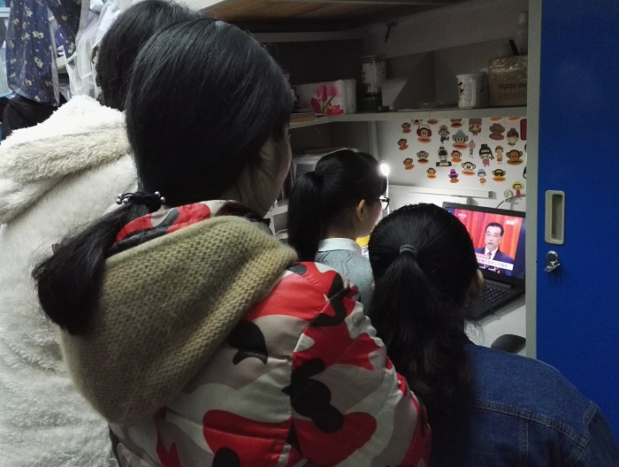 为促进我系学生党员学习会议精神,关注会议召开,3月5日晚,经济政法系党员活动办公室特组织我系学生党员在宿舍观看第十二届全国人大五次会议开幕。