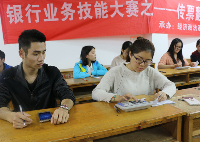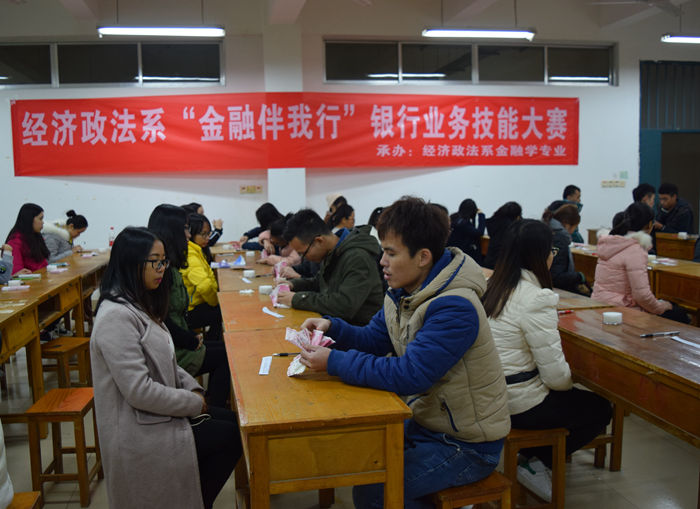 经济政法系第四届“金融伴我行”银行业务技能大赛于11月16日顺利启动,12月2日圆满落下帷幕。本次比赛分设“点钞基本功”、“传票翻打” 、“客户信息录入”三项比赛,金融学教研室负责人及另两位有多年银行从业经验的老师担任此次大赛的评委和策划,本次大赛还特别邀请到桂林银行芙蓉支行行长助理翟玉及另一位从业多年、柜面技能丰富的柜员担任大赛的技能指导。