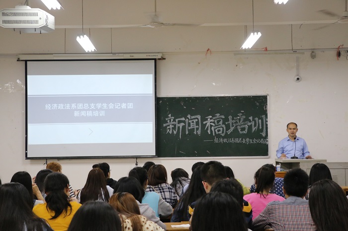 为进一步做好新闻管理和宣传工作,4月19日晚,经济政法系团总支学生会记者团于1501教室开展“新闻稿培训”活动,并特邀党总支书记甘华成老师作为主讲人。我系团学各部门成员以及各专业的团支书参加了此次活动。