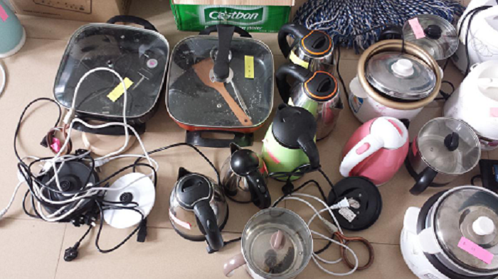 团学干部们分批对寝室进行了细致检查,发现大功率电器予以没收。在检查过程中,收缴了:电磁炉1个,热得快2个,电饭锅15个,热水壶7个。