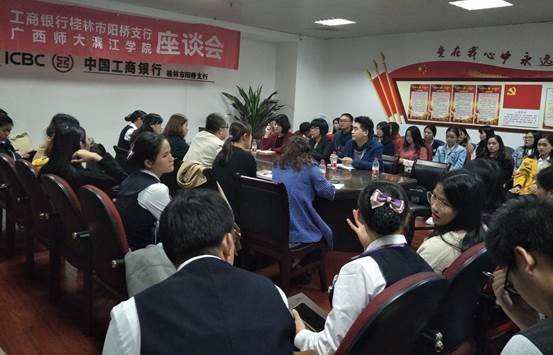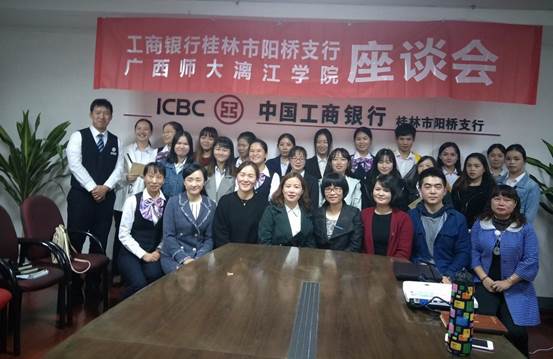 为加强我系校企合作,表彰我系优秀实习生,10月16日,经济政法系师生代表前往工商银行桂林市阳桥支行开展座谈会。参加此次座谈会的是:工商银行桂林分行人力资源部领导、工商银行阳桥支行领导,经济政法系系主任覃顺梅、党总支书记秦丽芸、教师代表、辅导员代表、学生代表。