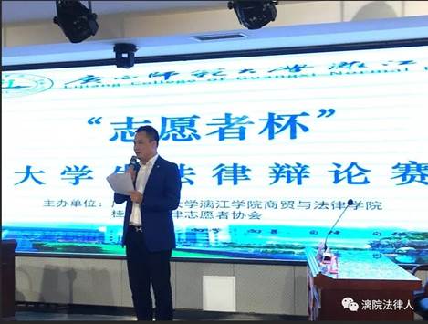 2019年5月31日晚19时,“志愿者杯”大学生法律辩论赛在至善讲堂成功举办。本次比赛由商贸与法律学院法学教研室与桂林市法律志愿者协会共同主办。漓江学院副校长杨庆庆老师,桂林市法律志愿者协会会长、广西昊旺律师事务所副主任秦建龙律师,商贸与法律学院院长林驰老师,广西嘉宸律师事务所执行主任文金发律师,商贸与法律学院党总支副书记陈建文老师,广西佳宾律师事务所主任王小兵律师,广西德恩律师事务所秦川律师,《口才与辩论技巧》课程讲师邹煜律师、黄云辉律师以及法学教研室教师出席了此次活动。