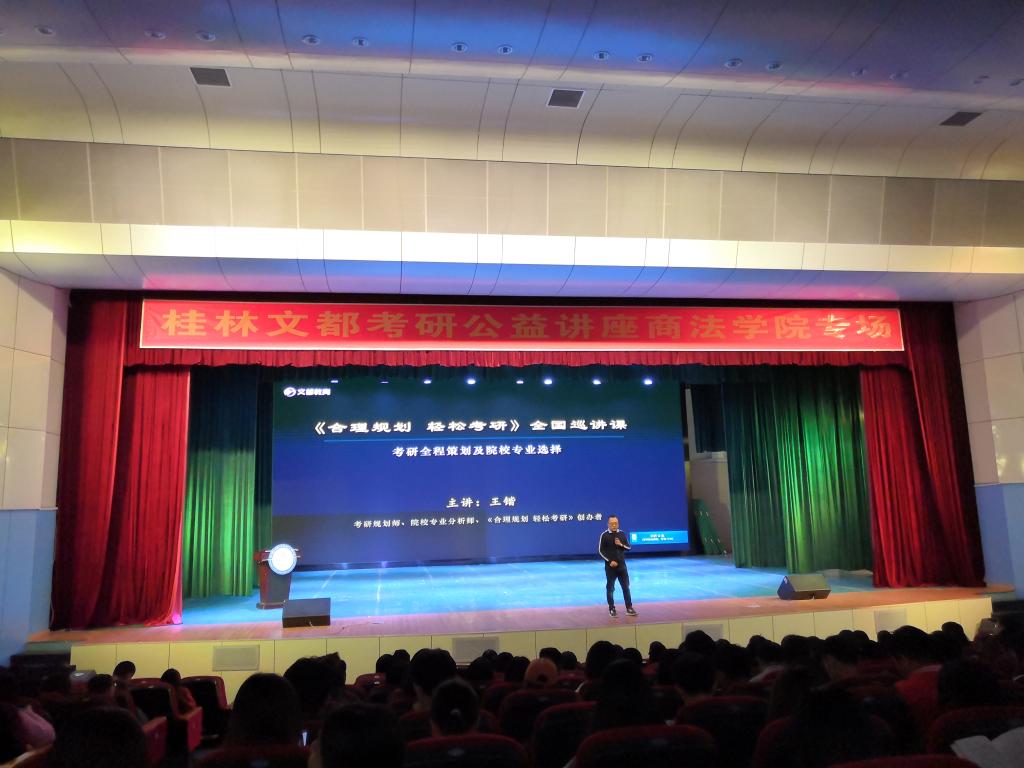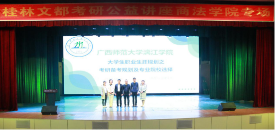 10月27日晚,商贸与法律学院于弘善讲堂开展了《大学生涯规划之考研备考规划及专业院校选择》讲座。讲座邀请到桂林文都负责人莫光钰、文都教育集团考研规划师王锴、院校咨询师廖财生、教务管理朱徐雯以及商贸与法律学院党总支副书记刘雪、各专业辅导员,全体2017级学生以及2018级部分学生代表共450参加了讲座。