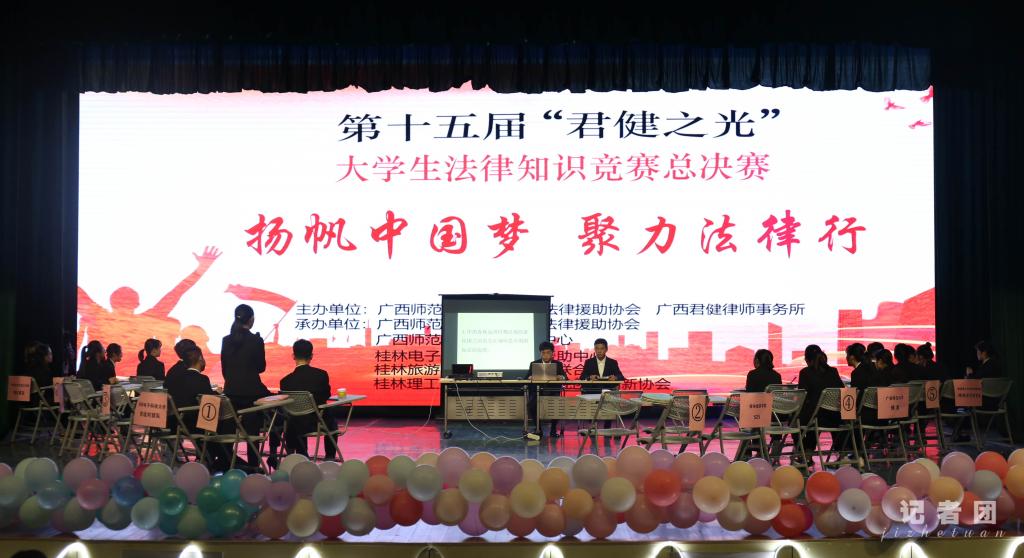 12月3日,我校法律援助协会主办的第十五届“君健之光”大学生法律知识竞赛的总决赛在弘善讲堂举行。我校副校长杨庆庆,桂林市人民检察院第二检察部甘桂明主任、广西师范大学法学院副院长陶斌智、广西君健律师事务所主任黄丽娟律师及律师团队成员,我校商贸与法律学院领导班子林驰、陈俊杰、陈建文、刘雪,法学教研室全体师生500余人参加了活动。