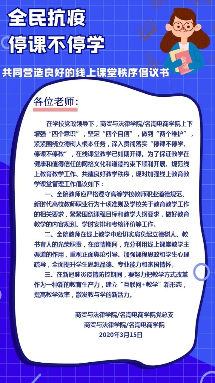 在学校党政领导下,商贸与法律学院/名淘电商学院上下增强“四个意识”,坚定“四个自信”,做到“两个维护”,紧紧围绕立德树人根本任务,深入贯彻落实“停课不停学、停课不停教”,在线课堂教学已如期开课。为了保证教学在健康和值得信任的网络文化和道德约束下顺利开展、规范线上教育教学工作、共建良好教学秩序,现对加强线上教育教学课堂管理工作倡议如下: