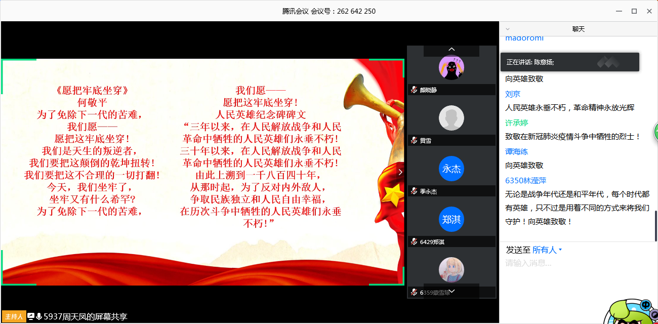 活动开始,党支部成员一起观看了《井冈山基地,缅怀革命先烈,致敬抗疫英雄》视频。同学们纷纷发表了自己的看法。其中,积极分子林滢萍说:“无论是战争年代还是和平年代,每个时代都有英雄,只不过是用着不同的方式来将我们守护。向英雄致敬!”随后,何裕汉、陈意扬同学分别朗诵缅怀先烈的诗歌,其余同学在讨论区也进行了分享。