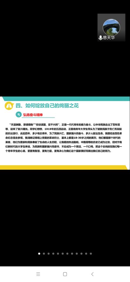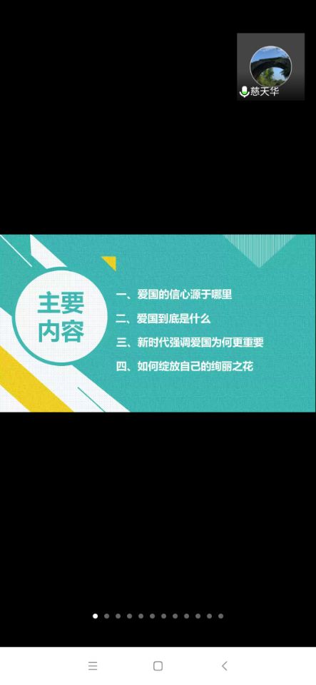 辅导员首先简单介绍了当前疫情防控和国内外复杂形势,从宏观层面引导出青年大学生爱国主义教育的意义。然后,他从四个方面阐述了爱国的信心源自于哪里、什么是爱国、爱国教育的重要意义和我们青年大学生如何“绽放自己的绚丽之花”。他引用了援鄂医疗队“90”后青年医护人员不畏风险,舍身奉献的精神,证明当年青年有能力堪担大任;举例方方和她的《武汉日记》,以一种极度负面阴暗的角度去歪曲武汉抗疫的事实,引发学生思考何为爱国。他引导同学们从澳门的爱国主义教育和香港暴乱的对比中思考,反思爱国主义教育的重要意义。