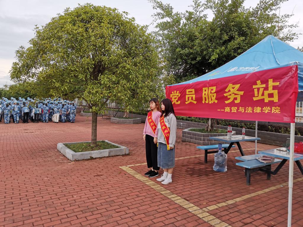 军训期间,为了弘扬“奉献、友爱、互助”的志愿精神,发挥“助人为乐,服务他人”的崇尚美德,商贸与法律学院党总支在漓院操场设立了军训党员服务站。从学生党支部中选拔了党员、积极分子作为党员服务站的志愿者,负责服务军训期间的教官和学生、引导各位新生尽快适应学校环境,完成各项准备工作,确保军训活动的有序进行。