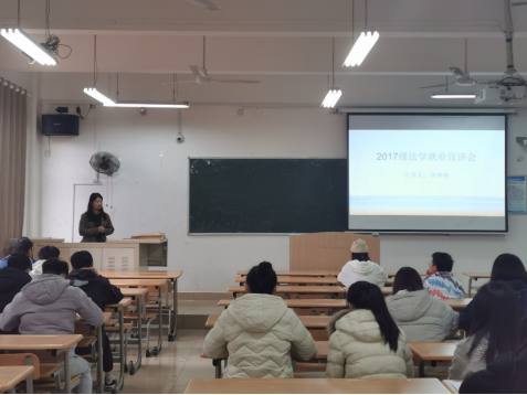 12月28日,商贸与法律学院2017级法学专业成功举办了2017级法学就业宣讲会。法学教研室主任钟林林老师、2017级法学辅导员宋丹阳老师以及2017级法学全体学生参加本次宣讲会。