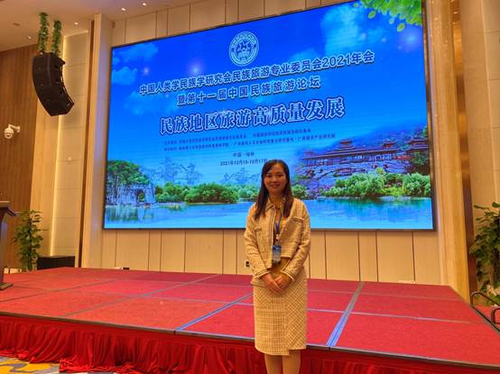 2021年10月16-17日,以“民族地区旅游高质量发展”为主题的第十一届中国民族旅游论坛在桂林召开。本次论坛由中国人类学民族学研究会民族旅游专业委员会和中国旅游研究院民族旅游研究基地共同主办,由桂林理工大学旅游与风景园林学院和广西高校人文社会科学重点研究基地·广西旅游产业研究院共同承办。来自广西、云南、贵州、内蒙古、甘肃、陕西、青海等17个省(自治区、直辖市)40家单位(高校、科研院所等)的140余名专家学者与会。我院旅游教研室主任钟珺老师应邀参加,并以“基于共生理论的程阳八寨田园综合体发展策略研究”为题做出精彩汇报,该论文荣获第十一届中国民族旅游论坛论文评选“一等奖”。