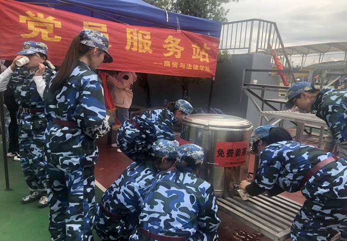 军训期间,为了弘扬“奉献、友爱、互助”的志愿服务精神,响应“互相帮助、助人自助、无私奉献、不求回报”的志愿提倡,商贸与法律学院在新生军训地点旁设立了由学生党员、积极分子组成的党员服务站,为新生们提供饮用水、基本医疗救护等服务,深入落实为同学服务的服务理念。