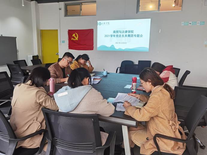 为扎实推进我院党总支对学生组织领导的具体化,进一步加强学生组织规范管理和健康发展,11月3日下午,商贸与法律学院2021学年党总支共青团专题会,商贸与法律学院党总支书记陈俊杰、副书记刘雪,商贸与法律学院团总支书记傅秋月、副书记谭海练以及全体辅导员参加了本次会议。